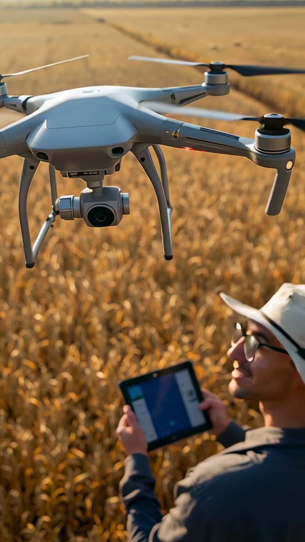 AI Generated Image. Drone hovering over golden wheat field, gimbal camera scanning crop canopy and collecting high-resolution imagery. Farmer wearing sun hat tapping tablet, monitoring live telemetry and adjusting flight path. Warm late-afternoon sunlight creating cinematic golden tones and long shadows. Vertical video framing optimized for mobile viewing and social platforms. Ideal for showcasing precision farming services, drone agritech demonstrations, crop health analysis, and farm management software. Useful for marketing campaigns, app store previews, product demos, training modules, investor pitches, and social media ads. Editors can overlay NDVI or thermal data, flight telemetry, map waypoints, and call-to-action graphics. Suggested voiceover topics: crop yield prediction, scouting workflow, return on investment for drone surveys, and sustainable agriculture benefits. Close-up drone shot providing clear foreground subject with blurred background, enabling safe space for text and logos in lower third. Recommend color grade warm, highlight enhancement, gentle vignette for focus. Export vertical 9:16 for mobile ads, convert to 16:9 for broadcast via cropping or adding sidebars.
