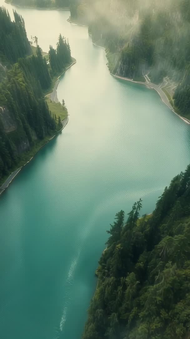 AI Generated Video. Drone capturing vertical sweep of turquoise river winding through misty pine gorge, showing upstream channel and forested cliffs. Water flowing smoothly between steep conifer slopes while morning fog drifting across treetops, creating tranquil cinematic mood. Use for travel video openers, outdoor adventure promos, eco tourism campaigns, nature documentary sequences, meditation or wellness backdrops, resort marketing, and social vertical ads. Ideal for mobile-first platforms and vertical storytelling where panoramic river reveal and forest detail are focal points. Technical notes and creative tips: Vertical 9:16 framing with slow gimbal movement providing smooth parallax and depth; soft fog diffusion enhancing mood; strong color contrast between teal water and deep green trees. Pair with ambient soundscape, gentle piano, or cinematic strings; apply color grade emphasizing teal and green tones; crop-safe for titles and lower third graphics during video edit.