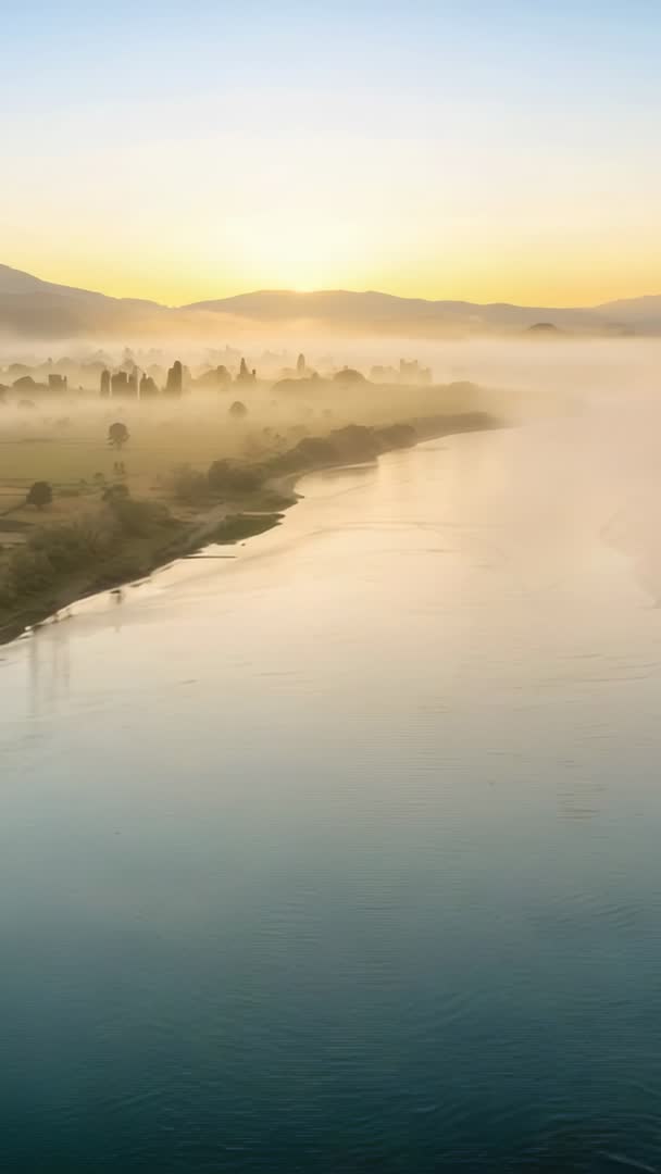AI Generated Video. Capturing sunrise over mist-covered river valley, revealing tree-lined shoreline and distant hills emerging from fog. Bathing landscape and water in soft golden glow, creating tranquil cinematic mood. Featuring smooth vertical composition and gentle motion, providing cinematic B-roll for drone footage needs. Working well for travel promos, wellness and meditation apps, nature documentaries, riverside real estate campaigns, environmental awareness videos. Supporting social media vertical content such as Instagram Stories, TikTok, Reels, mobile ads, phone wallpapers. Allowing color grading and slow motion overlays, fitting title sequences and background loops. Supplying peaceful mood shots for editorial use, websites, brochures, corporate presentations, resort marketing. Offering high-resolution vertical frame for portrait-oriented screens and mobile-first storytelling.