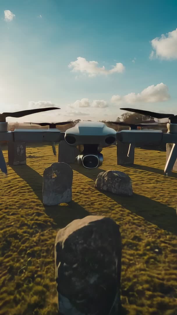 AI Generated Video. Flying low through ancient stone circle during golden hour, revealing stabilized gimbal camera and spinning propellers. Framing vertical footage with strong horizon line and long shadows, delivering cinematic depth and dramatic foreground elements. Capturing rural landscape and historic standing stones with warm backlight for rich color and texture. Ideal for travel and tourism promos, archaeology documentaries, drone technology advertisements, and social vertical reels. Useful as hero opener, background for titles, or insert for scene transitions. Enhancing suggestions include adding slow motion for rotor blur, applying warm color grade, preserving ambient field audio, and using subtle stabilization for smooth playback. Recommended clip length 10-30 seconds and exporting in 4K vertical formats for mobile platforms and social sharing.