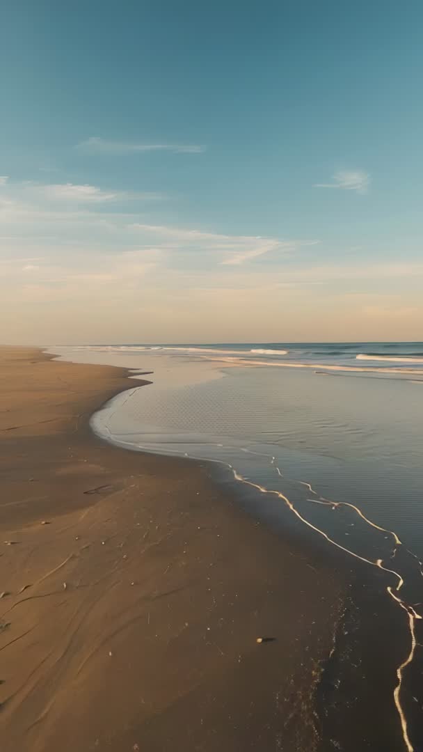 AI Generated Video. Providing vertical drone footage of advancing tide curving along foamy shoreline under warm golden hour light. Showing wet sand textures, scattered shells, gentle wave reflections, distant horizon line. Working well for mobile reels, social media stories, travel promos, wellness and meditation videos, real estate coastal listings, environmental and ocean conservation stories. Featuring smooth camera movement suitable for slow motion, looping backgrounds, hero banners, website headers, broadcast openers. Supporting color grading for warm pastel tones and adding text overlays or ambient soundtracks. Evoking calm, solitude, and natural beauty ideal for marketing, editorial, and lifestyle projects.
