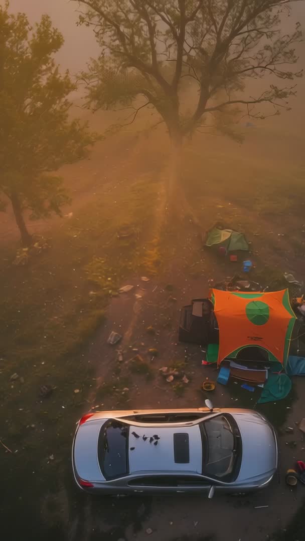 AI Generated Video. Vertical drone footage capturing dawn light piercing soft haze over silver car and bright orange camp tent beneath large tree. Overhead perspective showing campsite layout, scattered gear, dirt track, and warm sunbeams creating cinematic golden glow and moody atmosphere. Clip conveying early morning adventure, quiet wilderness, and outdoor camaraderie while maintaining strong vertical composition tailored for mobile screens. Use for travel and adventure promos, outdoor gear commercials, campground or park marketing, social media reels and vertical ads, editorial features about camping culture or morning landscapes, and cinematic B-roll for documentaries. Editing suggestions include slow reveal pan, warm color grade, subtle lens flare, ambient wind or bird sound to enhance immersion. File working well as attention-grabbing opener, background visual for text overlays, or short-form vertical content for Instagram, TikTok, and mobile-first campaigns.