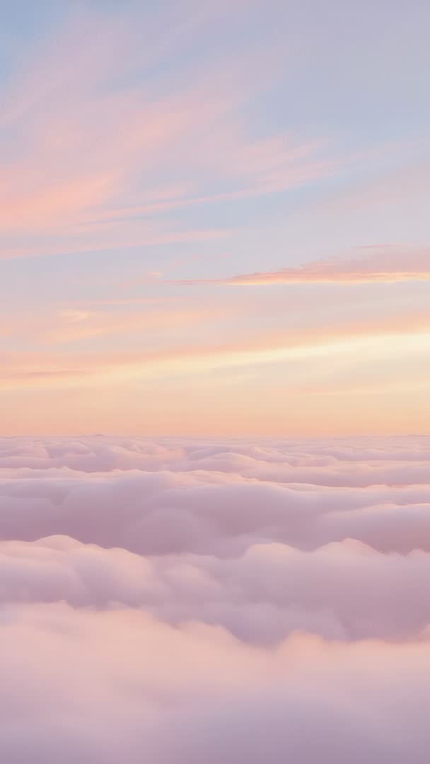 AI Generated Image. Vertical drone video showing sunrise light shifting across pastel cloud layer from aerial perspective. Soft pink, peach and lavender tones creating dreamy, ethereal atmosphere. Gentle cloud motion providing calm, meditative visual for wellness, mindfulness, spa and sleep aid content. Ideal for vertical social media stories, mobile lock screens, meditation app intros, inspirational quote overlays, travel and aviation promos and atmospheric brand videos. Easy to loop for ambient backgrounds and cinematic transitions. Offering high resolution and cinematic color palette supporting color grading and text placement.