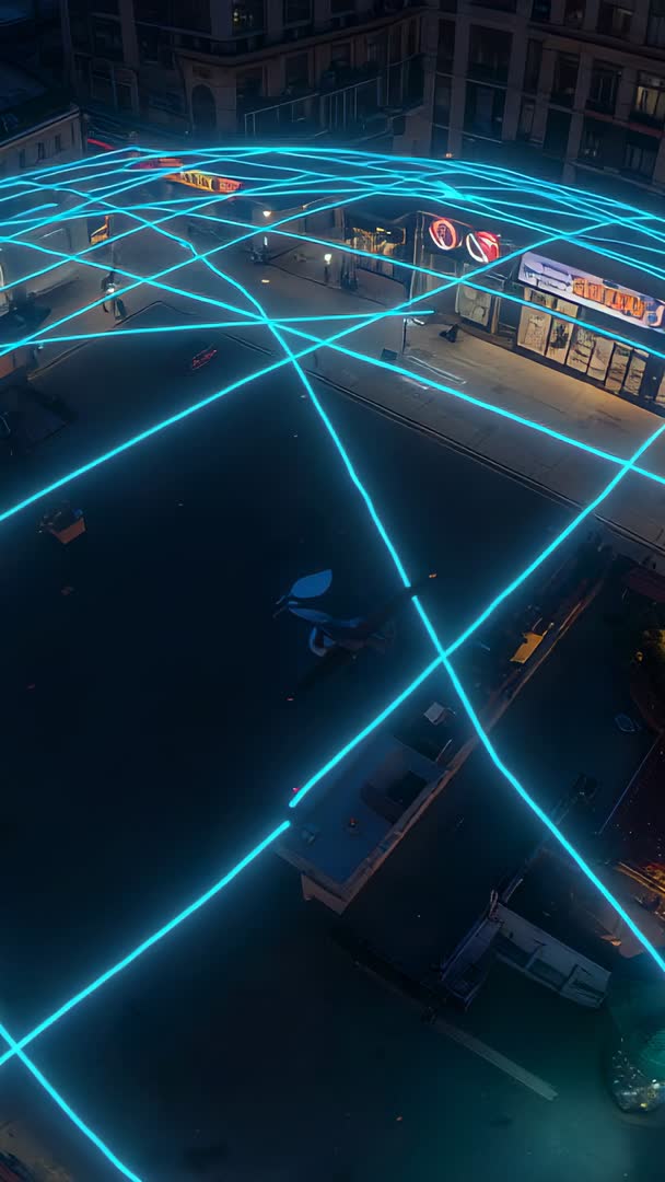 AI Generated Video. Showing neon cyan beams tracing intersecting grid above open plaza during night, with people wearing coats moving through luminous pathways. Aerial vertical composition creating cinematic sense of scale and motion while neon lines glowing against dark architecture and storefront signage. Ideal for technology and smart city themes, futuristic or cyberpunk storytelling, nightlife promotions, broadcast openers, social media reels, and event trailers. Suggesting edit ideas: cropping for vertical 9:16, adding ambient synth soundtrack, applying teal and orange color grade, slowing motion for dramatic emphasis, overlaying titles and motion graphics on negative space. Useful for advertising, editorial coverage of urban light festivals, architectural visualization, film VFX plates, and background for product launches.