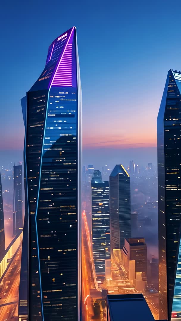 AI Generated Image. Opening vertical drone video zooming into sleek skyscraper at dusk, revealing purple LED crown and linear neon accents. Camera continuing descent to show illuminated glass facade, glowing city streets, and distant skyline shrouded in evening haze. Composition highlighting verticality, modern architecture, and contrast between warm street lights and cool purple-blue illumination. Ideal for tech brand intros, corporate presentations, real estate marketing, urban lifestyle content, social media vertical ads, skyline montages, broadcast intros, and motion graphics overlays. Use as cinematic opener, background for title sequences, or transition shot in promotional reels. Providing space for lower-third graphics along right or left margin and for bold headline text in upper third. Delivering modern, futuristic mood suiting product launches, architectural showcases, and city tourism campaigns.