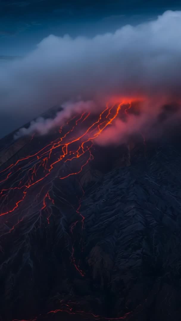 AI Generated Image. Vertical aerial video capturing volcanic crater vent at dusk, showing glowing lava rivers pulsing down flanks and ash-smoke plume rising into sky. High-contrast red-orange lava glow against dark volcanic rock creating dramatic cinematic mood and strong visual contrast. Ideal for enhancing documentary sequences, news coverage, educational geology explainers, emergency response briefs, cinematic openers, social media vertical ads, mobile wallpaper and travel hazard warnings. Suggesting slow-motion segments, deep color grading to boost contrast, map overlays and lower-thirds for location context, ambient rumble audio for atmosphere. Useful as stock footage for film, TV, online video, environmental campaign, tourism advisory and VFX reference.