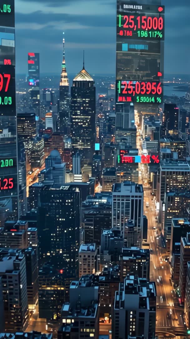 Vertical dusk financial district skyline with streaming stock ticker panels updating market data Video