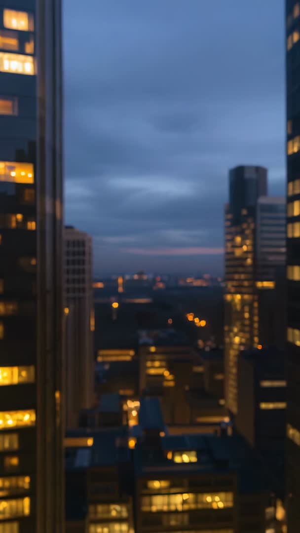 AI Generated Image. Vertical video showing city skyline at dusk viewed from office window. Camera holding shallow focus while foreground towers frame distant horizon, lights gradually appearing in windows and streets, sky shifting from cool blue hour to deep indigo. Composition combining warm interior lights with cool exterior tones, creating cinematic and moody atmosphere with soft bokeh highlights. Useful as background for corporate presentations, website hero banners, social media reels, promotional videos, real estate or architecture showcases, news or weather intros, and cinematic title sequences. Works well for looping ambient scenes, overlaying text or logos, and adding atmospheric transitions for urban lifestyle and nightfall stories.