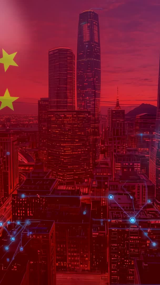 AI Generated Image. Vertical video opening with dusk city skyline showing layered red flag stars along left edge while neon network nodes pulsing across rooftops. Camera pulling back, revealing towering skyscrapers and linked data lines mapping urban IoT and communications flow. Color palette featuring deep red tones and cool blue accents conveying national tech theme and cyber connectivity. Motion design using subtle glow and particle links emphasizing data movement and node interactions. Use cases including tech company intros, news segments about digital infrastructure, government or industry reports on connectivity, cybersecurity presentations, vertical social media ads, and corporate event openers. Clip working well as background for headline text, animated logo reveals, lower third graphics, or cinematic transitions in mobile-first productions. Delivery ready for color grading and text overlays; consider adding branded call-to-action or voiceover for marketing campaigns.