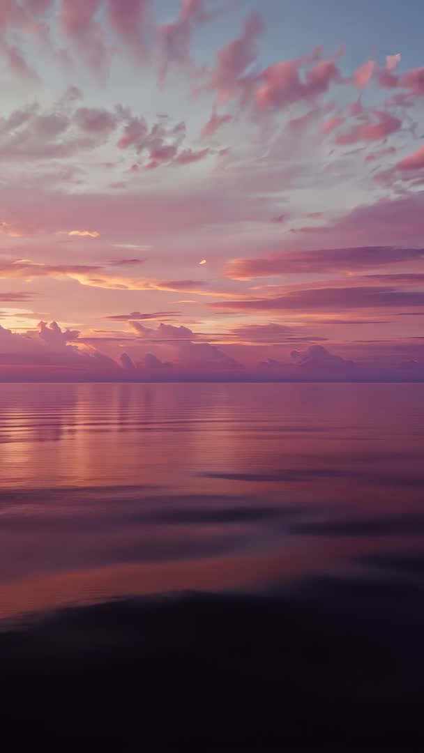 AI Generated Video. Vertical footage showing sun sinking toward horizon, sea and sky shifting into soft pastel pink and purple tones while gentle ripples reflect layered clouds. Minimal composition providing strong vertical negative space for copy and logo placement, making footage ideal for mobile backgrounds, Instagram Stories, TikTok ads, and app splash screens. Working well for meditation and wellness content, travel and resort promotions, ambient loops, and cinematic title sequences. Editing suggestions include adding subtle slow zoom or seamless loop, pairing with soft piano or nature soundscape, and applying gentle color grade to enhance pastel mood.