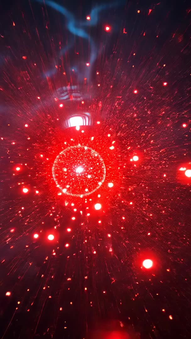AI Generated Image. Featuring vertical 9:16 format, pulsing crimson core radiating sparks and sending radial streaks and specks outward while forming ring halo and drifting blue mist. High contrast red and blue palette creating dramatic sci-fi mood, suitable for title sequences, social media ads, music visualizers. Loopable short clip working well for VJ backgrounds, trailer intros, app onboarding, event promos, or product launch teasers. Overlaying bold headline or logo over upper dark area for striking opener or lower third animations. Providing abstract energy effect for science content, space themes, futuristic tech presentations, or background for streaming channels. Editable in common NLE software using speed ramping, color grading, glow and particle compositing. Deliverable as royalty free stock clip for commercial licensing, broadcast, or online campaigns.
