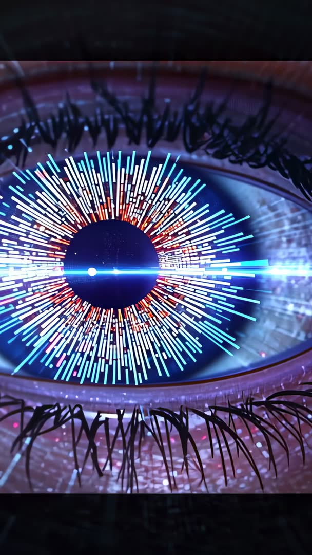 - Vertical eye scan showing holographic HUD iris scan with futuristic light beam and particles