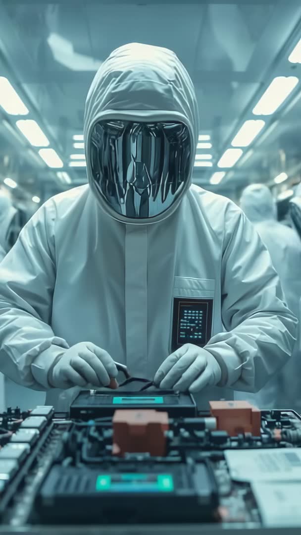 AI Generated Image. Featuring technician wearing cleanroom suit and mirrored visor, aligning PCB connector with precision tweezers on vertical assembly line. Offering close-up vertical footage highlighting hands, connector, and PCB components with cool blue lighting and sterile cleanroom environment. Serving marketing teams and technical communicators for corporate technology reels, manufacturing process demonstrations, training modules, product launch clips, investor presentations, and social media shorts. Suggesting edits such as adding slow-motion reveals, extreme close-up cutaways, on-screen callouts naming components, animated wiring diagrams, and ambient electronic soundtrack for high-tech atmosphere. Ideal for website hero reels, trade show loops, online courses, product datasheets, and editorial features about electronics manufacturing, quality control, and cleanroom procedures.