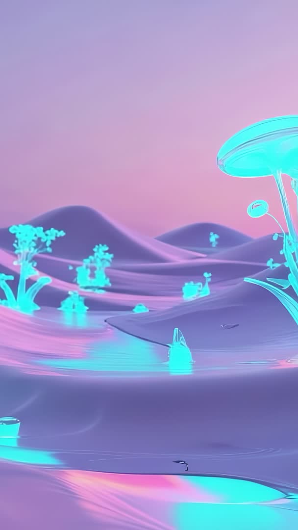 AI Generated Image. Vertical looping video featuring glossy dunes, cyan liquid pools, glowing mushrooms and floating orbs under soft pastel sky. Color palette blending cyan and magenta, creating vaporwave, dreamy sci-fi mood ideal for mobile-first projects. Use for mobile backgrounds, social media stories, vertical ads, music visualizers, title sequences, meditation app backgrounds, livestream overlays and event visuals. Loop-ready composition offering seamless repetition for ambient playback. Offering generous safe area at top and bottom for text overlays and logos without obscuring main elements. High-resolution digital render suitable for 4K export and modern vertical screens. Work well in branding campaigns, app intros, creative commercials and NFT promotional clips to evoke futuristic, otherworldly identity. Editing tips: use gentle crossfade or beat-synced cuts to enhance rhythm; apply subtle color grade to match brand palette. Use loop as ambient background for relaxation, meditation or chill electronic music mixes.