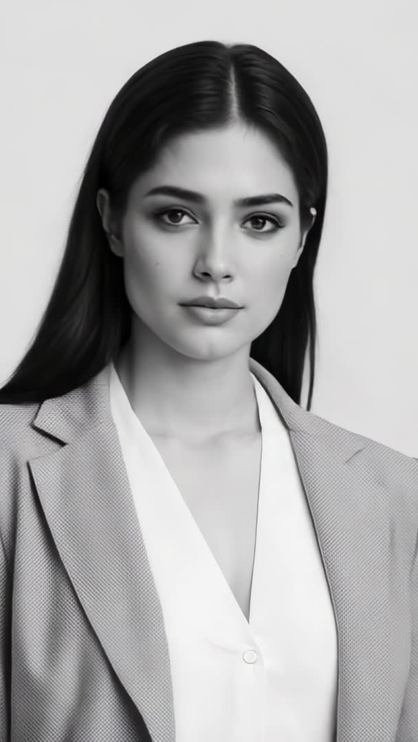 AI Generated Image. Showing close-up vertical clip of model turning head while wearing tailored blazer and silk blouse in minimalist studio. Conveying elegance, confidence, and professional style through soft lighting and neutral background. Working well for fashion campaign intros, social media reels, brand teasers, e-commerce lookbooks, corporate profile videos, and editorial reels. Leaving generous negative space for title, logo, or text overlay at top or bottom. Suitable for black and white branding, beauty tutorials, and casting or portfolio presentations. Delivering versatile clip that is easy to crop for square or horizontal formats while keeping center subject framed. Ideal for use by stylists, creative agencies, fashion retailers, corporate communications, and content creators.