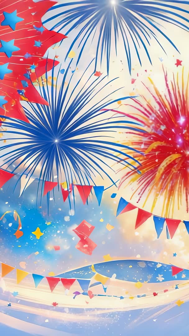 AI Generated Image. Featuring bursting fireworks, fluttering bunting, drifting confetti and sparkling stars against pastel sky gradient with red and blue highlights. Creating dynamic vertical motion perfect for social stories, reels, TikTok, mobile ads, event intros and countdowns. Providing loop-friendly composition and clear central space for text overlays and logo placement. Pairing well with upbeat music, animated titles and color-corrected footage for holiday campaigns, grand openings, festival promotions, party invitations and celebratory broadcasts. Editing tips: slowing motion for cinematic effect, adding light flares and drop shadows for depth, matching color grade to brand palette.