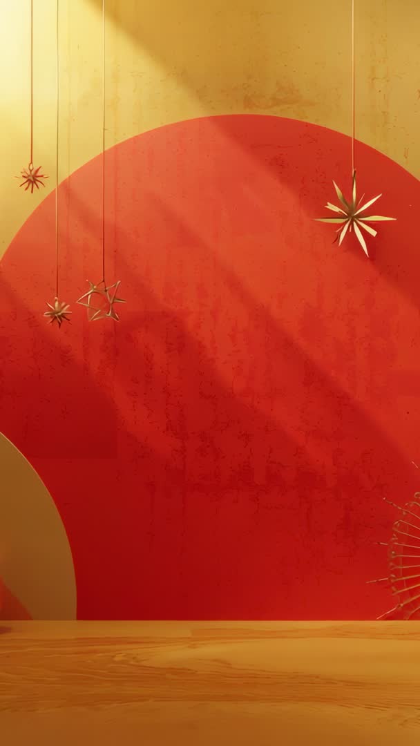 AI Generated Image. Video showing golden ornament sliding into view at 8 seconds, hanging stars gently swaying over minimalist red and gold backdrop with wooden display surface. Lighting creating warm cinematic glow with soft diagonal shadows and subtle grain texture for vintage feel. Motion happening at 8s mark, offering clean reveal for product showcase, logo animation, title card. Composition providing ample negative space for text overlay, vertical framing optimized for social platforms. Ideal for holiday marketing, seasonal promotions, ecommerce product spotlight, Instagram Reels, TikTok ads, event invitations, in-store digital signage. File working well as loopable clip or short intro for festive campaigns.