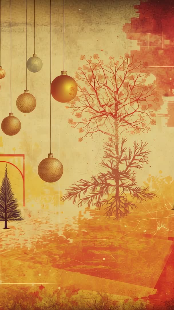 AI Generated Image. Featuring swaying ornaments catching warm glow against textured gold wall and delicate tree silhouette, creating warm nostalgic mood for holiday content. Offering vertical 9:16 composition with generous copy space for titles, logos, lower third text and product overlays. Suiting social media reels, Instagram Stories, TikTok ads, seasonal promo videos, greeting clips and website hero backgrounds. Looping-friendly motion and soft sparkles creating gentle bokeh highlights, allowing smooth slow-motion or time-lapse edits. Color palette focusing on gold, amber and soft red, pairing well with elegant serif or modern sans-serif typography; recommending subtle vignette and warm grade for cohesive look.