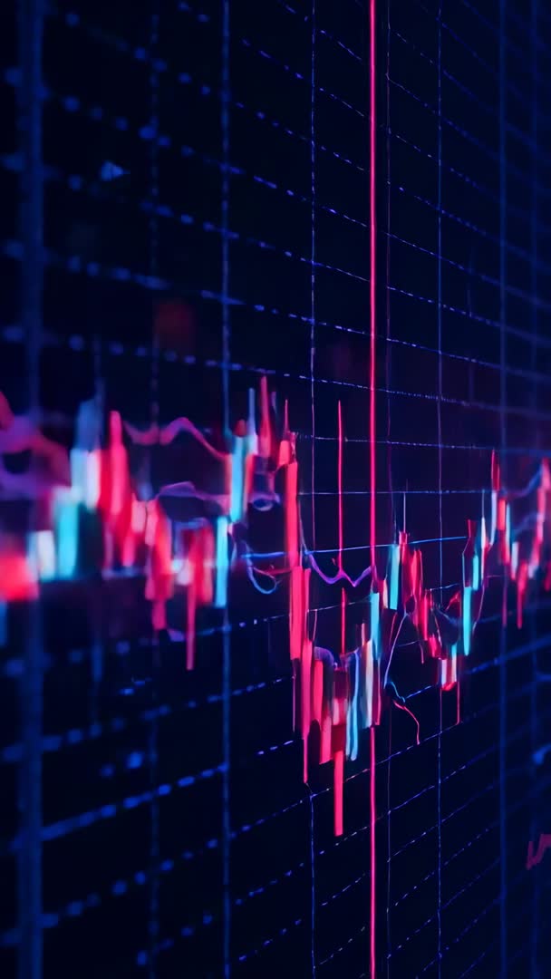 AI Generated Image. Vertical video showing animated red and cyan candlestick chart moving across dark grid with thin trend lines and sharp spikes, illustrating price action and market volatility. High-contrast neon palette and modern tech-forward look creating strong visual impact for finance and trading content. Ideal for financial news openers, trading platform demos, investment firm promos, cryptocurrency channel intros, market analysis explainers, app previews, social media vertical ads, and website hero banners. Use as looping background behind text overlays, lower-thirds, or data callouts; pair with voiceover or ticker feed to enhance real-time feel. Compatible with mobile reels, stories, TikTok, and Instagram Reels. Color grading and speed adjustments working well to match brand identity and campaign tone.