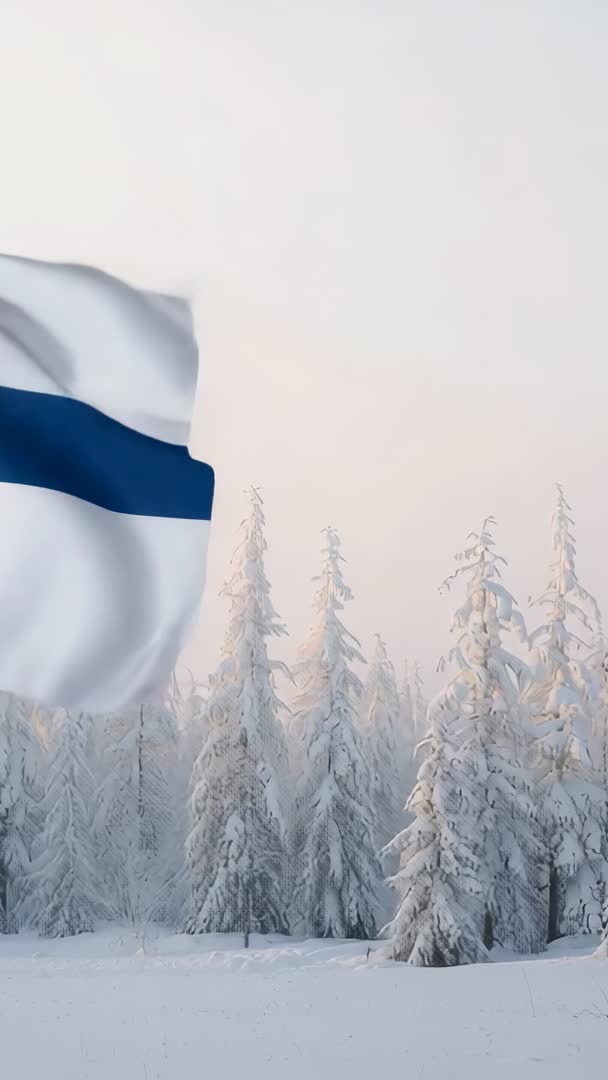 AI Generated Video. Showing vertical footage of flag with blue stripe waving over expansive snowfield and tall snow-covered pine and spruce trees during soft sunrise light. Compositional space on right side offering clean copy space for headlines, logos, lower thirds, or vertical text overlays. Mood conveying cold calm and minimal beauty with pastel sky tones providing elegant backdrop. Ideal for social media stories, reels, mobile ads, holiday or national celebration content, outdoor lifestyle and tourism promos, environmental and seasonal campaigns. Using slow-motion or looping movement to create seamless background, adding subtle parallax or text animation, exporting in 9:16 aspect ratio for vertical platforms.