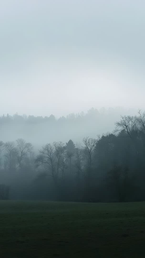 AI Generated Video. Providing vertical footage of slow fog drifting across woodland ridge into meadow, creating layered silhouettes and soft muted palette. Capturing quiet morning mood with bare deciduous trees and distant conifer outlines blending into misty gradient sky. Ideal for use as background for titles, app splash screens, social media reels, wellness and meditation videos. Enhancing film openers, documentary B-roll, atmospheric commercials, website hero sections, and mobile wallpapers. Allowing easy color grading, slow-zoom or parallax effects for cinematic mood; pairing well with ambient soundscapes or soft piano. Supplying versatile clip for stock libraries, editorial projects, nature reels, and environmental campaigns.