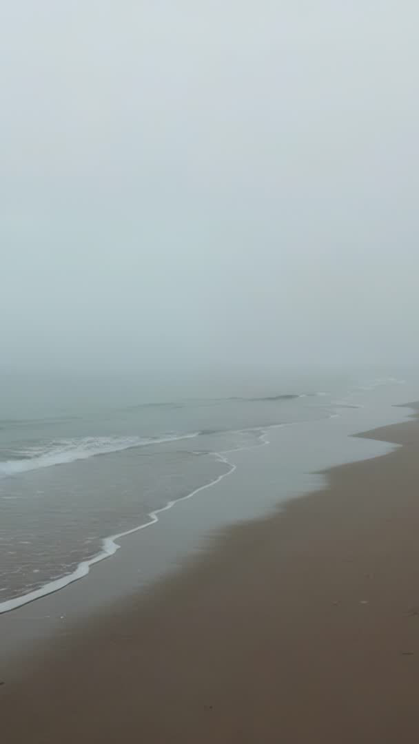 - Vertical foggy shoreline video with gentle waves lapping sandy beach and thin foam lines