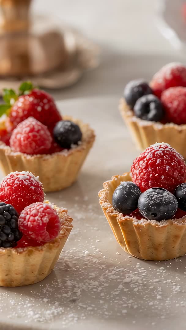 AI Generated Video. Vertical 9:16 video capturing camera zooming and pulling front tartlet into sharp focus while background tartlets remain softly blurred. Fresh raspberries, blueberries and blackberries sitting on jam and cream inside golden pastry shells, dusted with powdered sugar and catching natural light. Close-up motion emphasizing texture of fruit, glossy jam and crisp tart edges with cinematic shallow depth of field and smooth rack focus. Useful for food blog intros, recipe reels, bakery promotional clips, menu hero visuals, social media ads, cooking tutorial overlays and product packaging. Recommended usage: trim to 6-12 seconds for Instagram Reels or TikTok, pair with ambient kitchen sounds or upbeat music, add title card and recipe text overlay, or use as loopable background for culinary website header or digital menu.