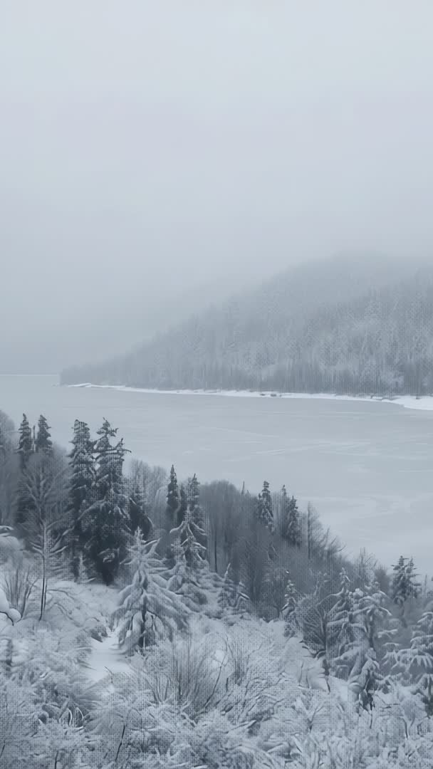 AI Generated Video. Vertical footage holding camera steady on snow-covered slope, showing frozen lake and fog-shrouded ridge. Falling snow softening contours, evergreen trees heavy with fresh snow in foreground. Overcast sky creating cool blue-gray color palette and soft diffuse light. Slow, steady motion providing calm, meditative mood and strong sense of solitude. Ideal for use in winter travel promos, environmental documentaries, weather segments, holiday campaign backgrounds, social media reels, and vertical video ads. Suitable as hero clip for mobile landing pages, calming loop for relaxation apps, and establishing shot for narrative film or commercial. Recommended edits include subtle color grading, gentle speed ramping, and ambient soundscape to enhance cinematic atmosphere.