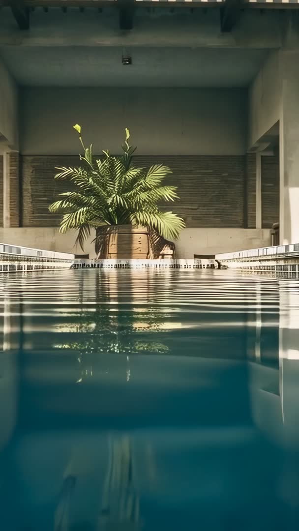 AI Generated Video. Video showing rippling turquoise water reflecting skylight and potted palm at far end of indoor pool hall. Composition using strong symmetry and low-angle perspective, creating calm, contemplative mood. Footage working well for wellness and spa promos, resort and hotel marketing, architecture features, and luxury lifestyle content. Ideal for vertical platforms such as Instagram Reels, TikTok, YouTube Shorts, and mobile hero banners. Clip looping cleanly as subtle background for websites, apps, meditation guides, brand intros, and social reels.