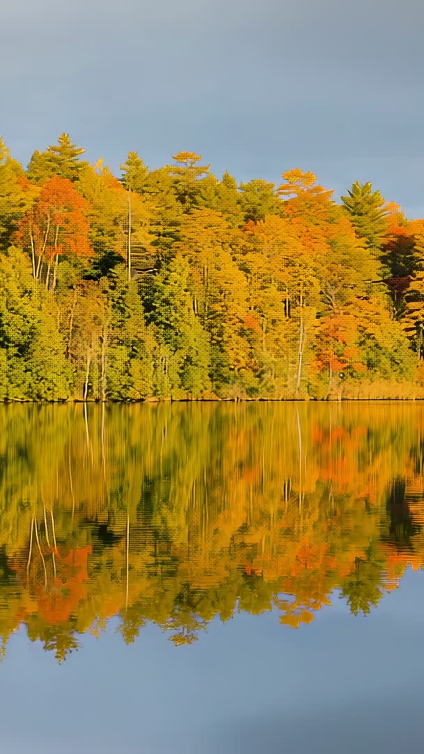 AI Generated Image. Vertical video showing shifting sunlight drenching autumn forest and producing rich golden reflection on calm lake. Footage offering slow, meditative movement and strong vertical composition ideal for mobile screens, social reels, landscape headers. Serving travel promotions, seasonal advertising, wellness and mindfulness backgrounds, nature documentaries, guided meditation loops, website hero banners. Looping friendly, gentle water ripples adding subtle motion while leaves are shimmering in warm tones. Color palette featuring gold, amber, green, soft blue sky for autumn campaign or brand storytelling. Delivering calm, reflective mood and strong vertical symmetry for elegant title overlays, slow motion edits, social vertical formats. Recommending use of 4K or high resolution for cropping, color grading to enhance golden hour tones, gentle crossfade for transitions.