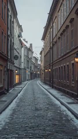 AI Generated Video. Showing narrow icy cobbled road curving between historic buildings with warm shop window glow and gaslamp illumination. Capturing quiet dusk atmosphere with empty pedestrian lane and reflective wet stones. Offering vertical framing optimized for mobile platforms and social media reels. Suggesting uses: travel promotion, historical documentary opener, neighborhood feature for real estate, lifestyle brand background, cinematic B-roll for film or TV, seasonal winter campaign. Allowing easy overlay of titles, logos, or subtitles in top and bottom safe areas. Recommending slow ambient music and subtle color grading to emphasize warm lamp contrast against cool snow.