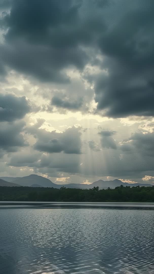 AI Generated Image. Vertical footage showing dramatic sunbeams piercing storm cloud layer and reflecting across mountain lake. Composition highlighting contrast between dark overcast sky and soft light rays, creating cinematic mood and sense of scale. Slow cloud movement providing natural motion for title sequences, social media reels, mobile wallpapers, and ambient backgrounds. Suiting use in nature documentaries, travel promos, wellness and meditation apps, weather segments, and environmental storytelling. Color grading friendly for moody teal and warm highlights. Delivering high-resolution vertical frame ideal for smartphone video, Instagram Reels, TikTok, and vertical video ads.