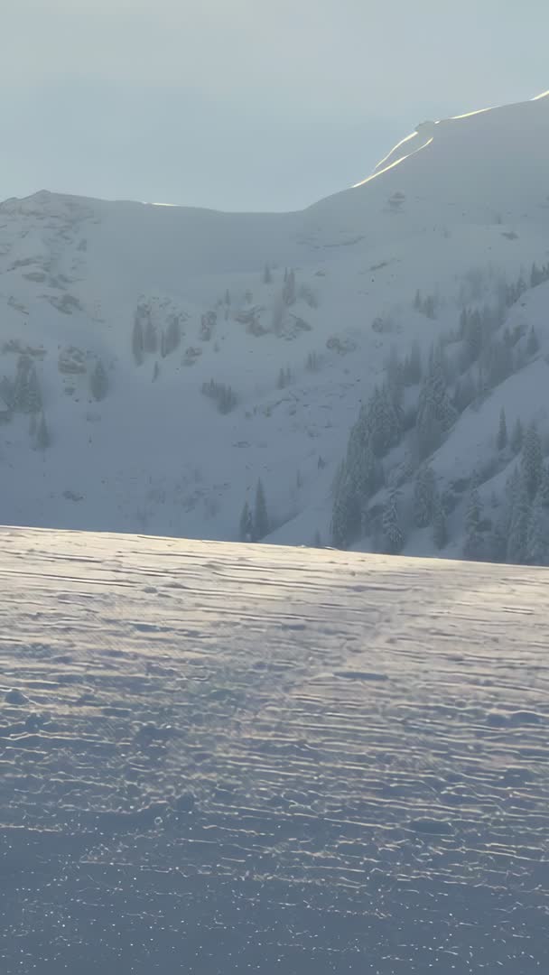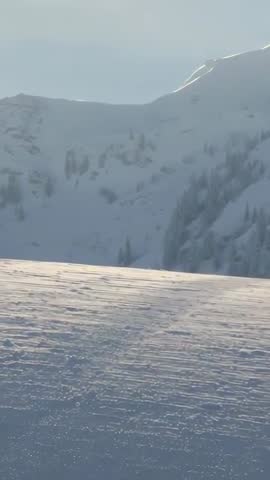 AI Generated Video. Footage capturing slow tilt across sunlit alpine crest, revealing rippled snow textures and distant pine-covered ridges. Sunlight glinting along upper ridge, creating warm highlights against cool blue shadows and delicate frost sparkle across foreground. Vertical 9:16 framing emphasizing height and depth, providing ample negative space in upper frame for text or logo placement. Cinematic slow motion or time-lapse edits complement moody, minimal winter visuals. Use for social media reels and vertical ads for travel, ski resorts, outdoor gear. Use for title backgrounds in adventure and expedition videos. Use for website hero video for mountain lodges and winter tourism. Use for product showcase and lifestyle content for cold-weather apparel. Use for seasonal marketing campaigns and environmental storytelling.