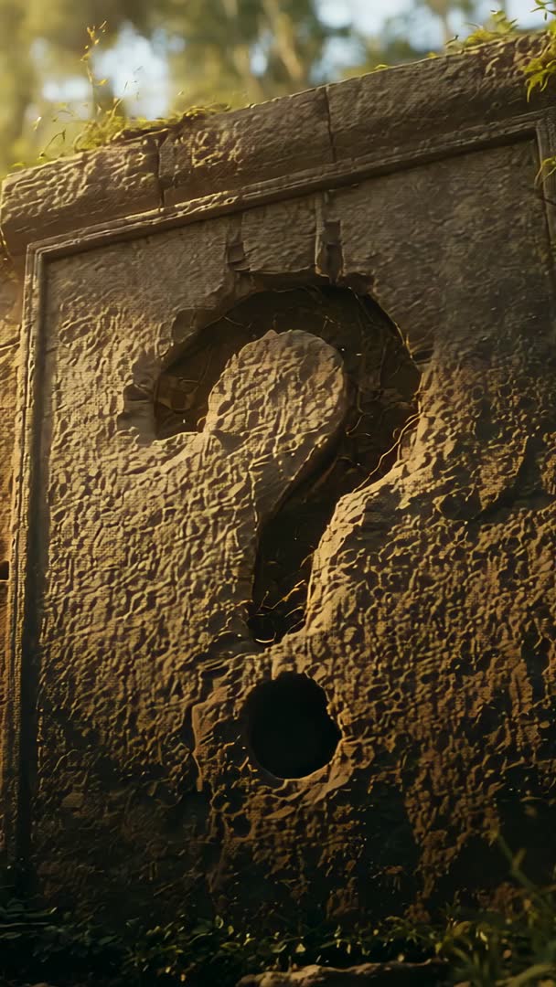 AI Generated Video. Camera moving inward over mossy ground, revealing weathered stone monolith carved with deep question mark hole. Warm sunlight filtering through canopy, casting textured shadows and highlighting chipped edges and creeping vines. Scene evoking mystery, discovery, lost ruins and ancient puzzle, with strong close-up texture and cinematic mood. Serving well in title sequences, cinematic openers, game trailers, escape room promos, mystery podcasts, archaeology documentaries, vertical social ads and mobile stories. Suggest adding ambient sound design, subtle particle effects, slow cinematic music and voiceover heightening suspense. Vertical 9:16 format and detailed surface texture making footage ideal for thumbnails, animated transitions and atmospheric intros.