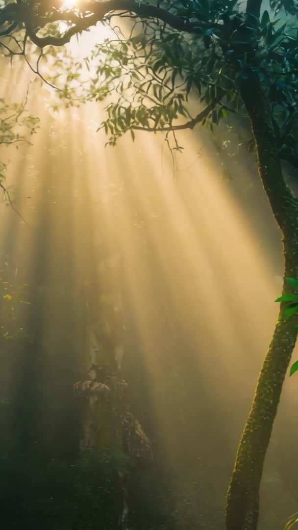 AI Generated Image. Camera panning vertically through forest while golden sunbeams filtering through canopy, revealing palm fronds and mossy trunk. Soft mist bathing undergrowth, creating tranquil, cinematic atmosphere and warm golden color palette. Scene working well for vertical platforms, translating to social media reels, smartphone wallpapers, meditation and mindfulness videos, travel promos, environmental campaigns, and documentary B-roll. Clip pairing nicely with subtle ambient sound design such as birdsong and gentle breeze. Composition offering loop-friendly rhythm and supporting slow-motion or gentle time-lapse treatments. Suggested uses include background for title cards, opening sequence for nature films, promo for eco-friendly products, visual for relaxation apps, inspirational social posts, and brand storytelling.