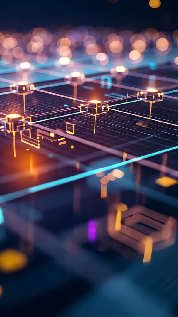 AI Generated Image. Vertical video pulling back from low angle, revealing futuristic circuit grid with glowing neon lines and pulsing hubs. Depth of field creating soft bokeh lights in background and layered sense of scale. Color palette featuring deep blues, cyan and magenta highlights with warm orange glows for contrast. Mood feeling high-tech, mysterious and energetic. Ideal uses: hero background for tech landing pages, app intros, blockchain explainers, cyber security presentations, vertical ads for social platforms, mobile wallpapers, music visuals and broadcast motion graphics. Creative suggestions: pairing with ambient electronic soundtrack, adding HUD overlays and animated node pulses synced to beat, looping for live stream backgrounds and title sequences. Production tips: leaving safe margins for captions, rendering vertical deliverables at 1080x1920 or 4K vertical, exporting loopable MP4/MOV and providing transparent alpha for overlay use.
