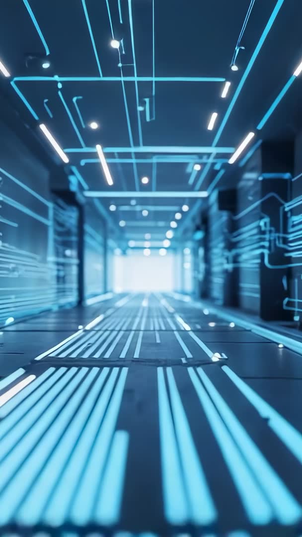 AI Generated Image. Vertical footage showing camera gliding through neon-blue light lines forming circuit-inspired tunnel. Scene offering strong sense of depth, speed and digital motion with soft-focus foreground and bright exit point for text overlay. Lighting featuring pulsing LED strips and reflective floor creating dynamic highlights. Ideal for tech product promos, cybersecurity or software presentations, startup pitch videos, mobile vertical ads, event openers, title sequences, VR transitions and music visualizers. Editing tips: loop segment for seamless background, add electronic synth soundtrack, apply teal-cyan color grade, use slow motion and speed ramps for dramatic effect, place bold typography near bright exit for high legibility. Delivery optimized for mobile-first platforms and vertical social feeds.