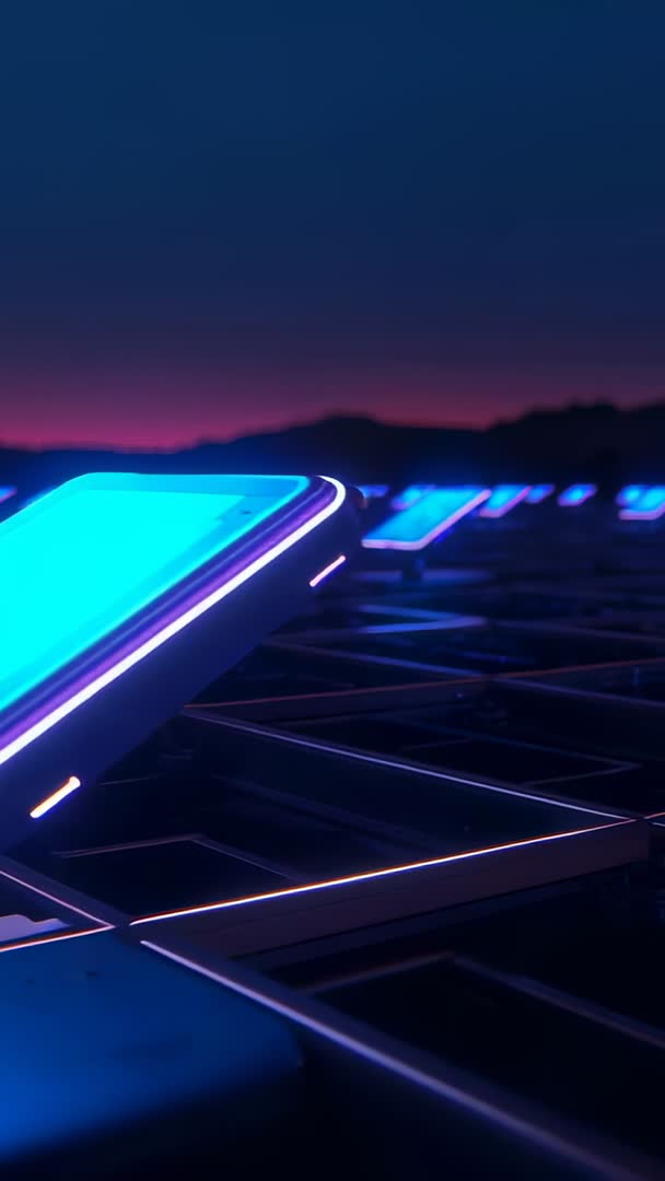 AI Generated Video. Showing vertical cinematic reveal of futuristic device pulsing neon cyan light, camera pulling back across reflective platform grid under twilight gradient sky. Foreground device tilting on illuminated stand while repeated panels stretch into soft focus, creating depth and motion. Strong neon reflections and cool color palette creating modern high tech mood. Use for tech product launches, mobile app demos, vertical ads, social media reels, UI intros, website hero animations, presentation openers, trade show displays and electronic music visuals. Customize with logo overlays, animated text, color grading and sound design. Vertical orientation optimized for smartphone reels and stories, leaving safe space for title and call to action. Suitable for futuristic branding, concept showcases and promotional backgrounds.