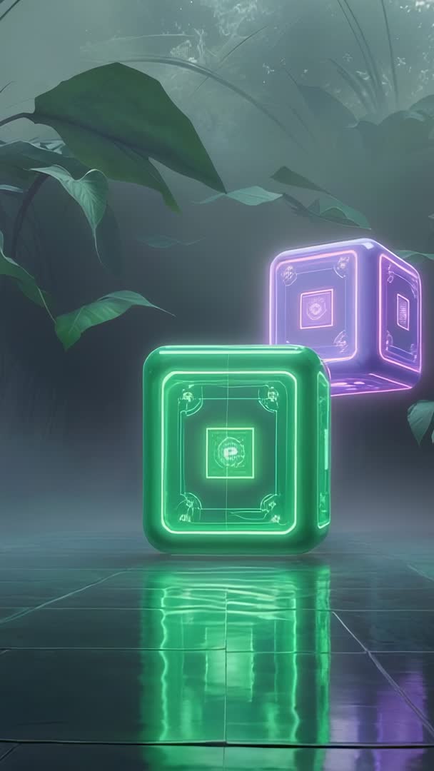 AI Generated Image. Vertical video showing neon green cube rotating amid mist and oversized tropical leaves, neon purple cube emerging behind and casting soft colored light across glossy tiled floor. Strong reflections and shallow depth of field creating cinematic, immersive atmosphere. Visual theme blending organic foliage with holographic geometry, conveying contrast between nature and futuristic technology. Use for vertical social ads, app splash screens, tech product reveals, music visualizers, AR/VR demos, livestream backgrounds, website hero loops, brand intros and concept reels. Loop-friendly composition supporting seamless repeat; 9:16 aspect optimized for mobile. HDR-like neon highlights providing rich color separation and easy keying for overlays. Suggested postproduction options include adding ambient synth sound, subtle camera parallax, animated title bars, and color grading to match brand palette. Licensing ideas include tech startups, gaming campaigns, electronic music promotions, sustainability meets innovation initiatives, immersive exhibition displays.