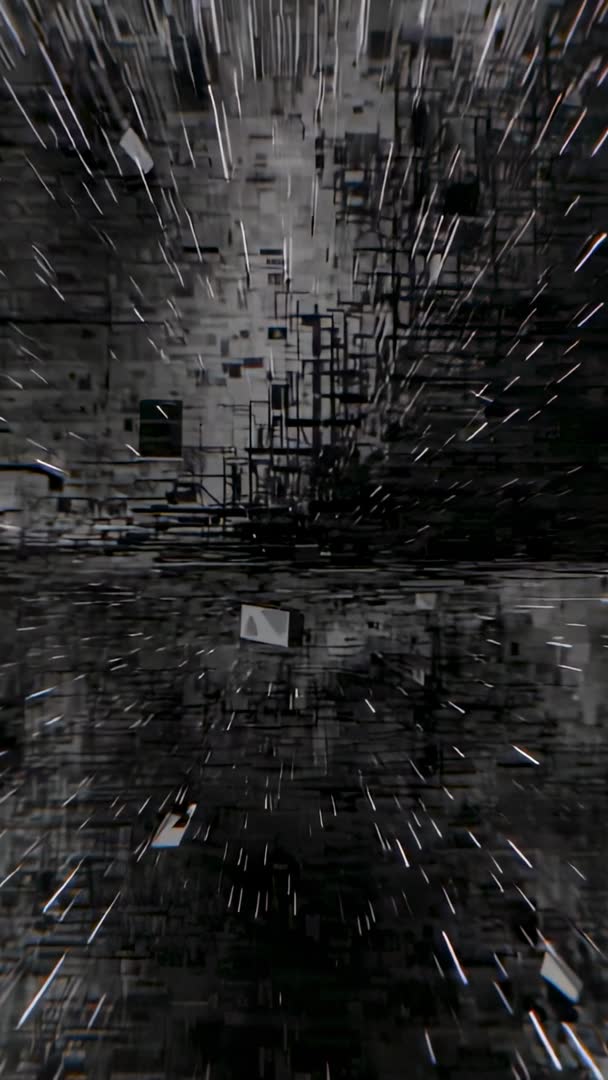 AI Generated Image. Vertical video showing camera moving through dark digital tunnel, creating streaks of light over floating blocks and grid structures. Visual language combining abstract geometry, glitch fragments and high-contrast monochrome palette, evoking high-speed data travel. Serving as background for tech presentation openers, app intros, social media vertical ads, music visualizers, VJ sets, broadcast stings and sci-fi scene transitions. Working well as looping clip for product promos, event backdrops and title sequences, matching dynamic beats and fast pacing. Ideal for mobile-first storytelling, immersive UI mockups and futuristic brand promos seeking minimalistic yet dynamic motion.