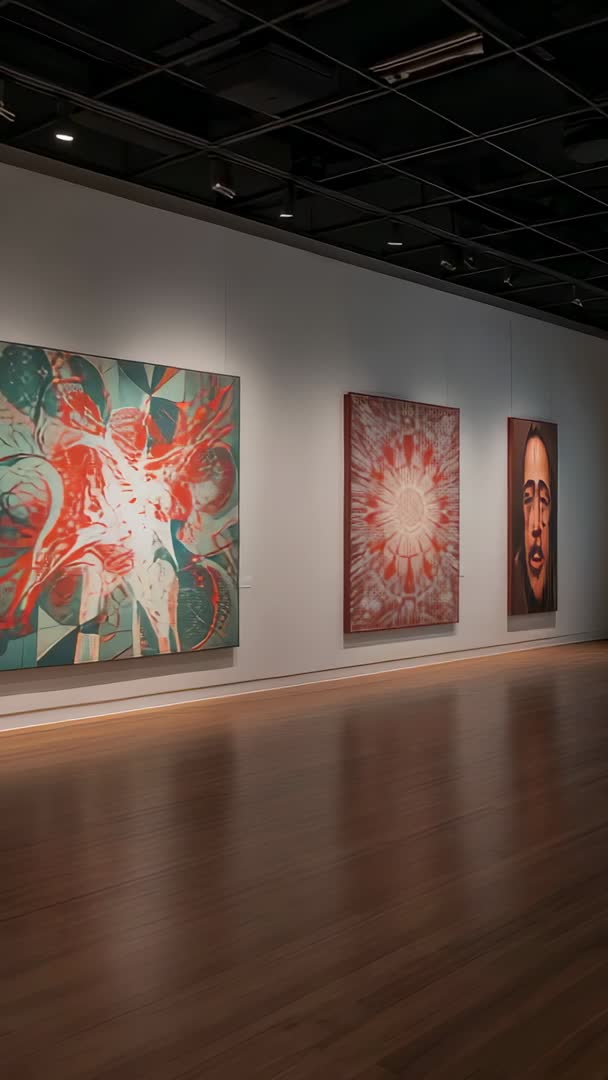 AI Generated Image. Vertical clip showing camera sliding left to right along gallery wall, revealing three large artworks: abstract mixed-media with teal and coral swirls, radial mandala with warm red tones, and close-up portrait with expressive features. Gallery lighting casting soft highlights and reflections on polished hardwood floor, enhancing cinematic mood. Useful for promoting museum exhibitions, social media reels, gallery walkthroughs, art event trailers, cultural tourism, creative portfolios. Suitable for background b-roll in documentaries about contemporary art, educational videos on visual arts, website hero banners, advertising for art fairs. Editable, color grade friendly and compatible with vertical platforms like Instagram Reels, TikTok, mobile stories, and app backgrounds.
