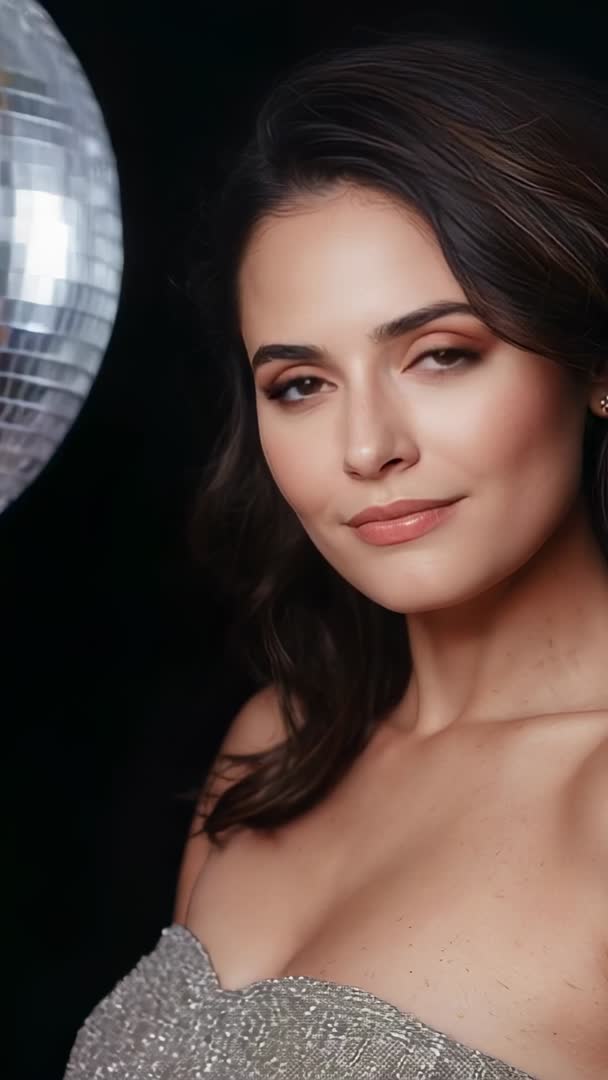 AI Generated Video. Vertical glamour video featuring model tilting head toward mirrorball. Close-up portrait showcasing subtle smile, evening makeup, and shimmering sequined strapless dress. Soft studio lighting creating warm skin tones and reflective highlights from disco ball. Composition focusing on face and shoulder, leaving dark negative space for text or graphics. Suggested uses include social media reels and stories, beauty and makeup ad campaigns, fashion lookbook videos, nightlife and party promotions, luxury brand hero clips, magazine editorial motion covers, influencer profile reels, event teaser videos, and cosmetics product intros. Suitable for overlaying logo, headline, or call-to-action in negative space and for cutting into short-form vertical content or longer editorial sequences.