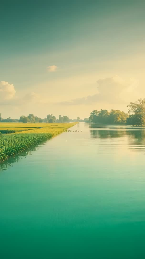 AI Generated Image. Video showing gliding camera moving along rural canal at golden hour, revealing turquoise water, soft reflections, grassy bank, and distant treeline. Warm sunlight casting gentle glow across landscape, creating serene, calming mood ideal for relaxation content. Small group of birds paddling near bank, adding natural motion and focal interest. Vertical composition providing perfect fit for mobile screens, Instagram Reels, TikTok clips, and portrait video ads. Serving meditation app backgrounds, travel and tourism promos, environmental or agriculture features, corporate openers, and stock B-roll for documentaries. Clip working well as looping background, hero header, or calming screensaver.