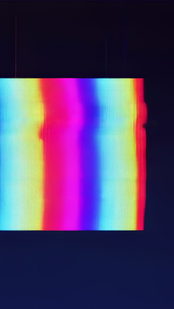 AI Generated Image. Vertical video showing glitching LED display with vivid neon rainbow bands, dense scanline grid and pixel distortion over dark studio backdrop. Bright chromatic bands bleeding into each other while vertical scanlines flickering, creating rhythmic noise and textured pixel grid. Composition 9:16 vertical, loop friendly for seamless playback, high contrast for strong on-screen impact. Use for music visuals, VJ loops, club visuals, social media stories, mobile video ads, tech promos, user interface transitions, motion graphics and website headers. Pair with electronic music, glitch sound design or kinetic typography, creating retro-futuristic and cyberpunk moods. Color palette featuring saturated cyan, magenta, yellow and red with electric blue accents, suiting neon branding, experimental art projects and modern visual identity work.