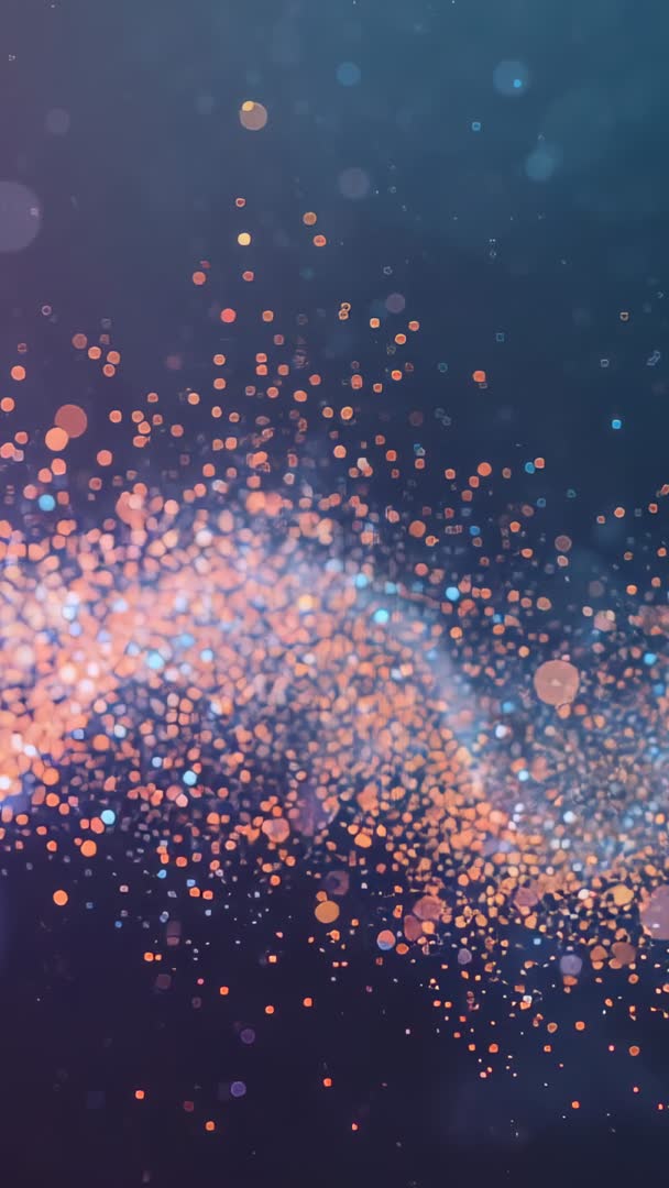 - Vertical glowing particle ribbon animating into soft bokeh orbs on teal purple gradient
