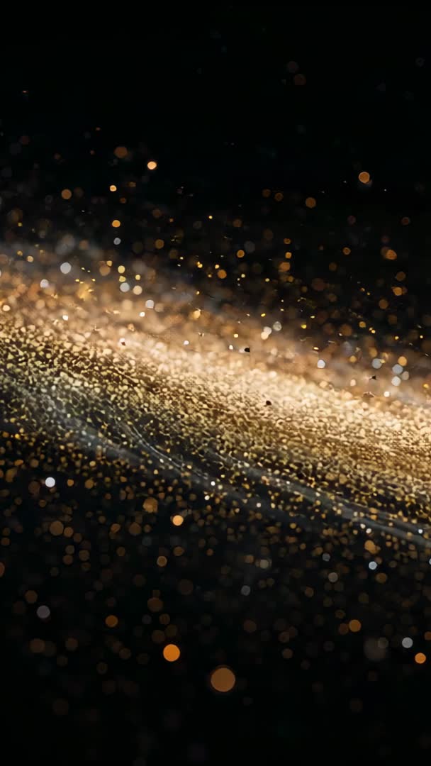 AI Generated Image. Vertical video showing gold ribbon drifting across black with dense left ridge sending glowing orbs and soft bokeh. Scene capturing shimmering particles, floating dust, and long glowing stream, creating luxury and celebration mood. Ideal for mobile backgrounds, social media stories, Instagram reels, vertical ads, and event promos. Working well as intro, title sequence, transition, product reveal, holiday greeting, invitation background, or logo reveal. Loop friendly and high contrast for easy text overlay and color grading. Providing cinematic shimmer for branding, fashion, beauty, wedding, and upscale event projects.