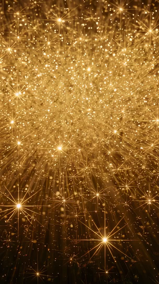 AI Generated Video. Vertical golden loop showing dense top cluster of sparkling particles cascading into twinkling starbursts with lens flare and soft bokeh, creating warm metallic mood. Motion featuring radiating light rays and scattered glitter particles for cinematic depth. Loopable seamless footage optimized for portrait projects and short-form vertical video. Ideal for enhancing holiday intros, building celebration openers, creating event promo backgrounds, styling social media Reels and Stories, composing wedding or anniversary openers, and elevating luxury product reveals. Editing suggestions: Layer under text using Screen or Add blend modes, adjust opacity for subtle depth, apply slight speed ramp for dramatic reveal, color grade to match brand palette, mask to expose content areas, and combine with cinematic sound design for stronger impact.