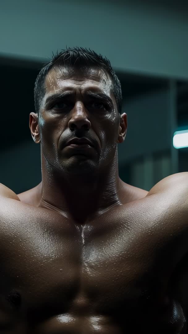AI Generated Image. Showing close-up of muscular man posing shirtless in gym, sweat highlighting muscle definition and intense facial focus. Lighting creating cinematic low-key mood and strong contrast on chest and shoulders. Vertical frame matching mobile-first formats and social reels. Suitable for fitness reels, gym advertising, bodybuilding promos, personal trainer marketing, supplement campaigns, strength training tutorials, motivational videos, and sportswear branding. Editing suggestions: using slow motion for dramatic reveal, adding punchy soundtrack and bold titles, applying warm color grade and high contrast to enhance muscle definition. Including short text overlays for call-to-action and logo placement. Licensing use cases: hero clip for campaign, background B-roll for training montage, thumbnail for workout tutorial, sample for physique portfolio. Evoking determination and focus for high-impact fitness storytelling.