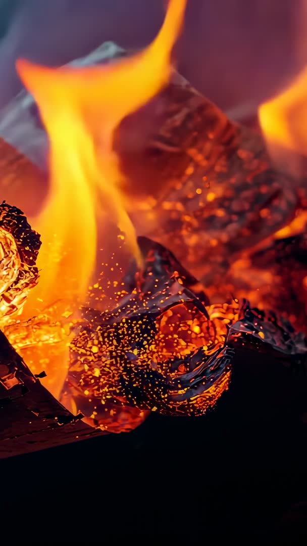 AI Generated Image. Vertical video capturing burning charred wood flaring in dark hearth, glowing embers and sparks flying, wisps of smoke curling. Footage offering dramatic close-up of flame motion, rich amber tones and high contrast for moody, tactile atmosphere. Material working well as looping background for mobile content, Instagram Reels, TikTok, Snapchat stories, and smartphone wallpapers. Use for seasonal marketing, fireplace product ads, hospitality promos, music visuals, meditation or relaxation loops, and film or video VFX. Layering with authentic crackling audio enhancing immersive feel. Color grading to emphasize warm orange highlights and deep shadows. Cropping and looping suggestions: repeat 10-30 second clips for seamless background, slow-motion sections highlighting ember details.