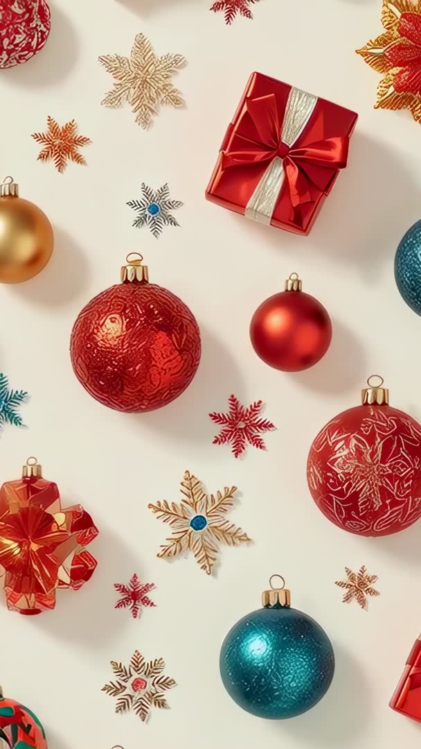 AI Generated Video. Vertical clip panning across tabletop display, centering red gift box tied with silver ribbon, showcasing glossy red and teal baubles and metallic snowflake ornaments on pale off-white backdrop. Soft studio lighting creating gentle shadows and subtle highlights on ornament surfaces, adding depth and festive sparkle. Color palette featuring classic holiday red, teal and gold tones, conveying warm, elegant seasonal mood. Clip working well for social media reels, stories, and vertical ads, allowing easy text or logo overlay on negative space. Use for holiday marketing, gift guide reels, ecommerce product promos, seasonal website hero banners, greeting cards, in-store digital signage and festive presentations. Looping-friendly composition supporting short-form video campaigns and automated backgrounds. Suggesting pairing with upbeat holiday music, animated typography, or product callouts to enhance engagement.